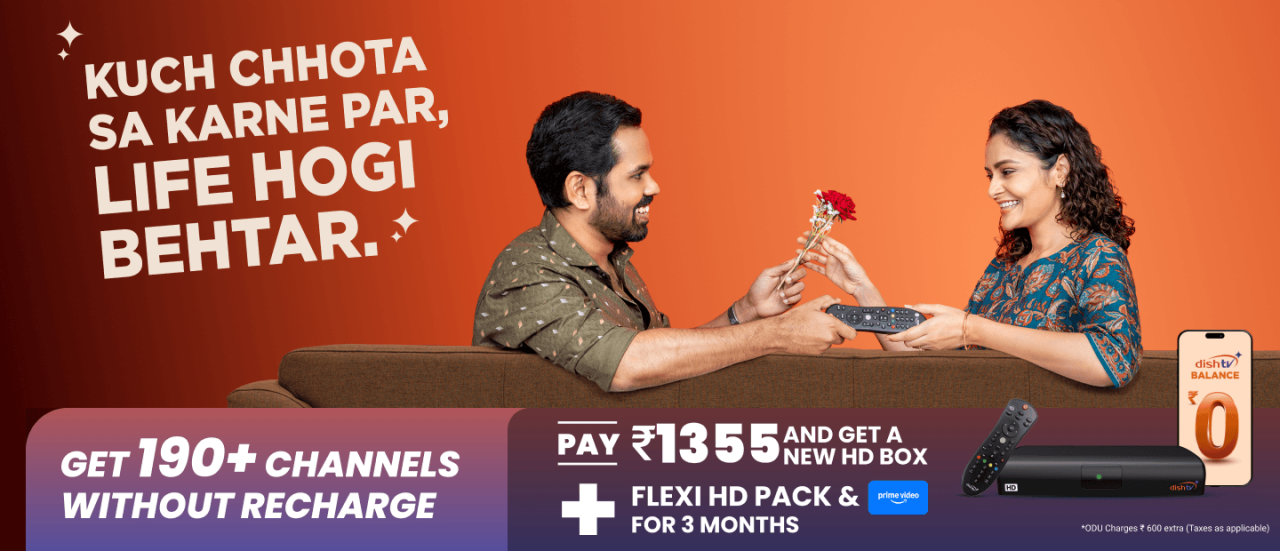 ഒരു പുതിയ ഡിഷ് ടിവി HD കണക്ഷൻ വെറും ₹1,599 മുതൽ ആരംഭിക്കുന്നു, അതിൽ HD സെറ്റ് ടോപ്പ് ബോക്സ്, 3 മാസത്തെ ഫ്ലെക്സി പായ്ക്ക്, സൗജന്യ ഇൻസ്റ്റാളേഷൻ എന്നിവ ഉൾപ്പെടുന്നു. ഇന്ത്യയിൽ ഒരു ഡിടിഎച്ച് കണക്ഷന് ലഭ്യമായ ഏറ്റവും മികച്ച HD സെറ്റ് ടോപ്പ് ബോക്സ് വിലയാണിത്.